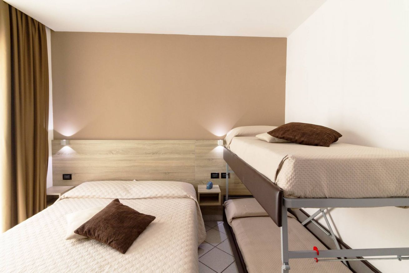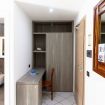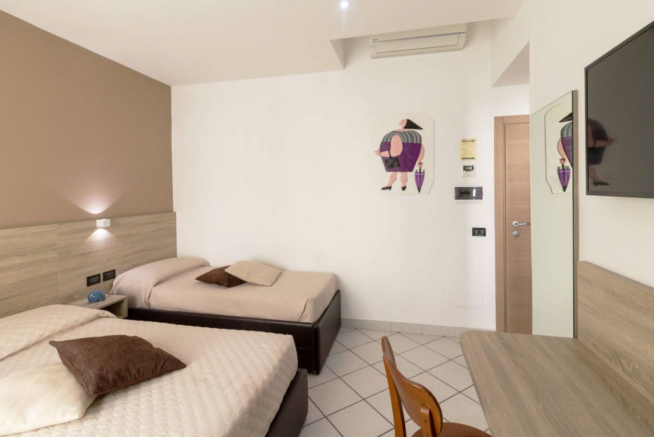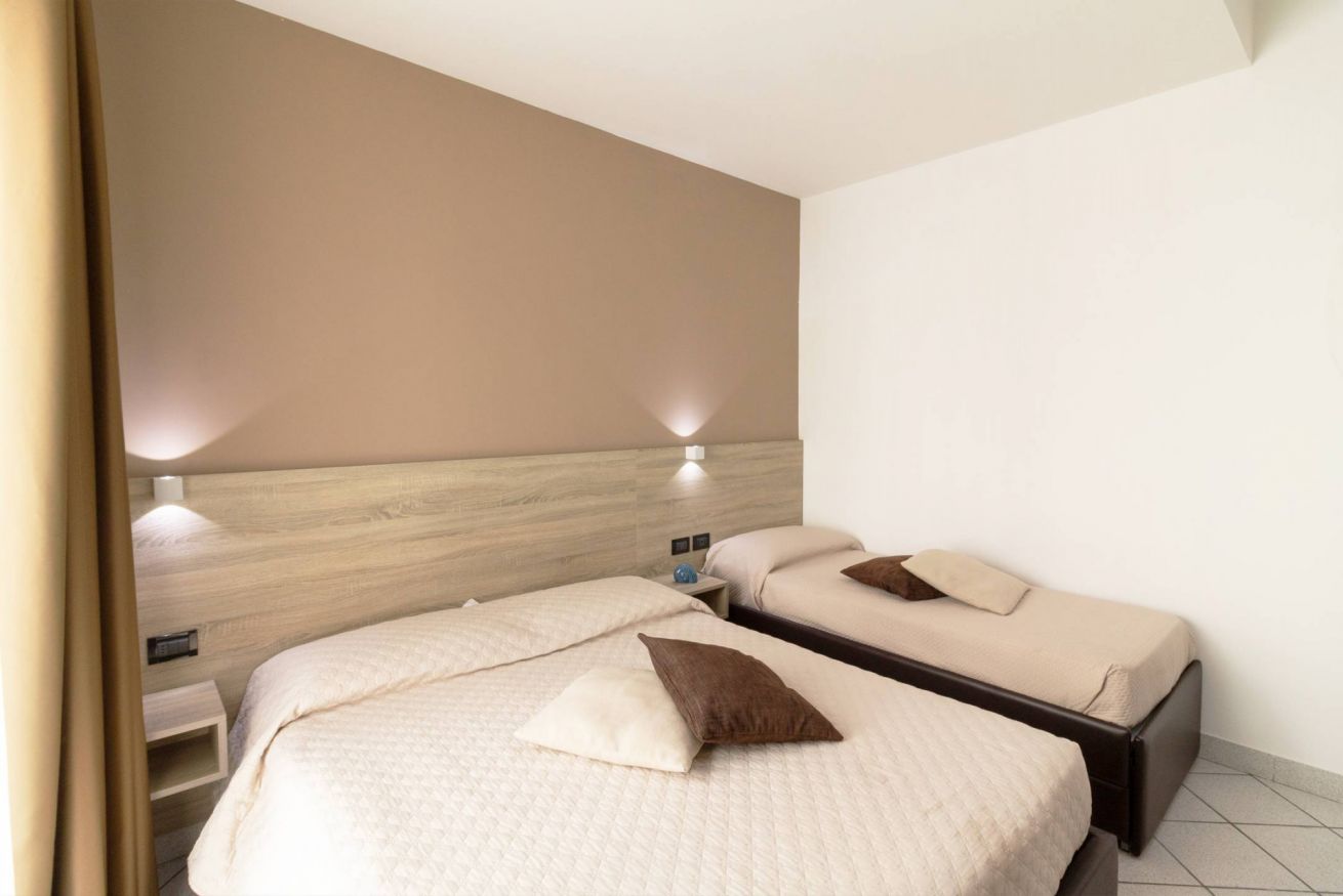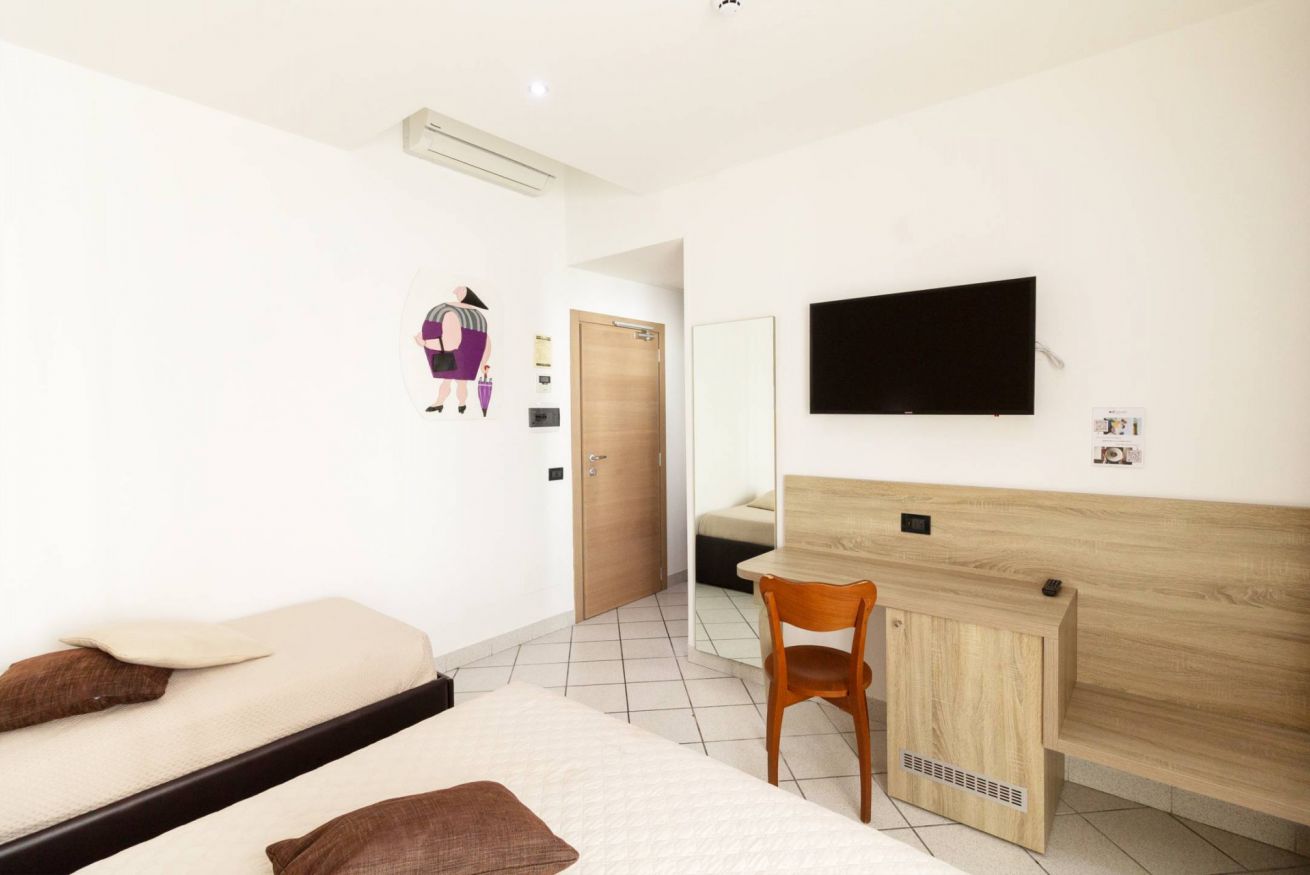 Camera con balcone senza vista mare oppure con terrazzino interno. Finemente arredata e accogliente. Dispone di letto matrimoniale e letto singolo che all’occorrenza si trasforma in letto a castello. Situata al primo piano, senza ascensore. Può ospitare 3 o 4 persone. – 17 mq.